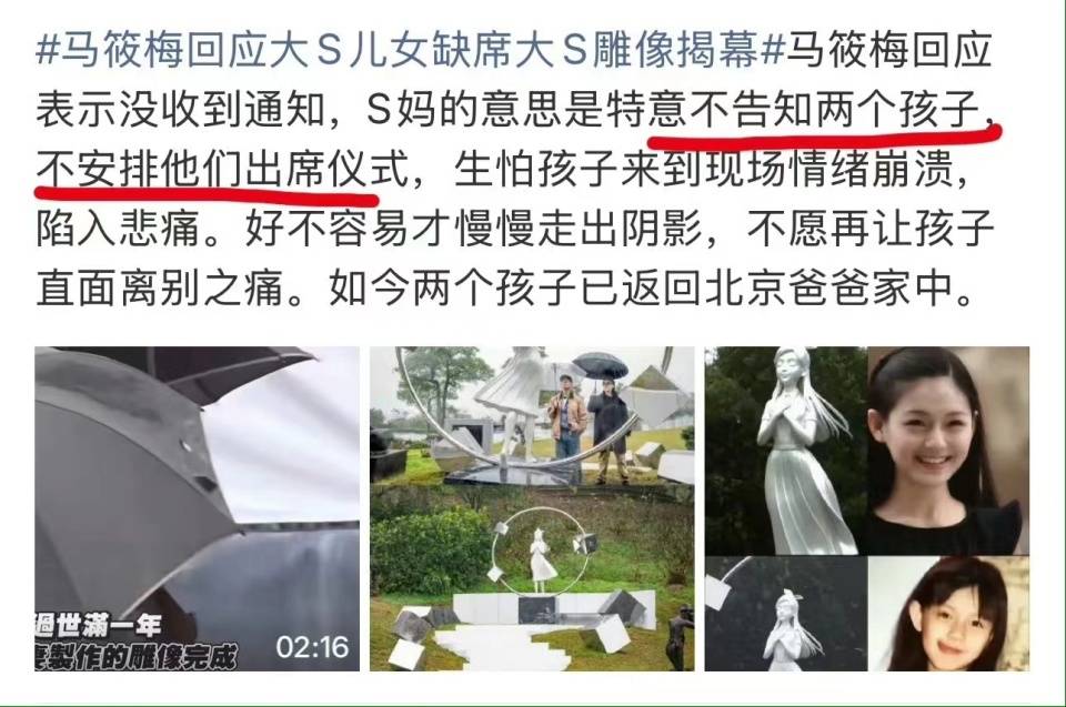 有网友揣测报道,S妈不安排两个孩子参加雕像揭幕或葬礼,不想特意告诉两个孩子,不安排他们出席仪式,生怕孩子来到现场情绪崩溃,陷入悲痛。好不容易才慢慢走出阴影,不愿再让孩子直面离别之痛。两个孩子在北京奶奶家过寒假,其实在2月2日雕像揭幕这一天,两个孩子和爸爸与继母马筱梅在广东出差,考察麻六记线下门店。