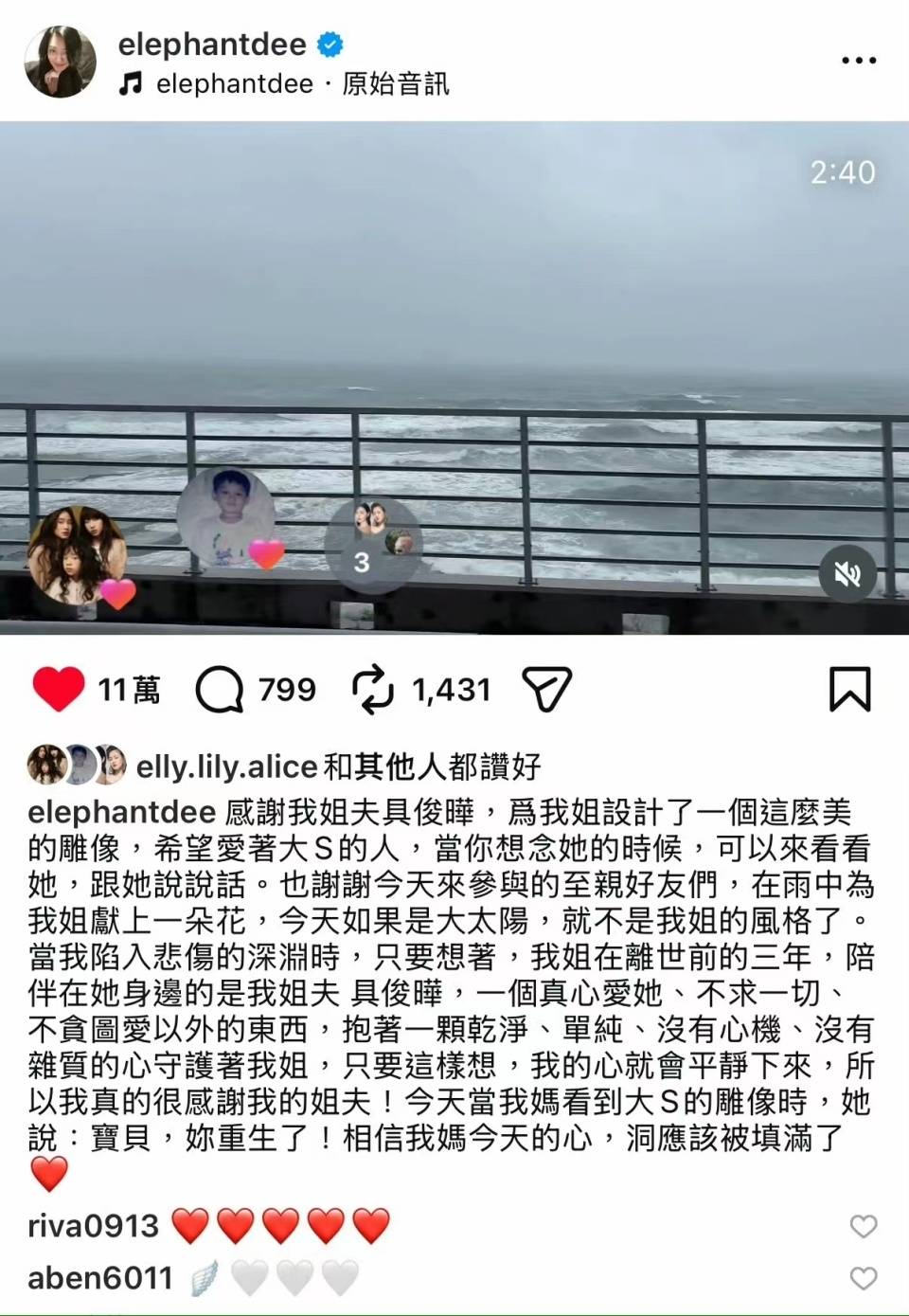 具俊晔不仅骗了S家人,小S居然还发文力挺姐夫,认为他真心爱大S,抱着一颗干净、单纯、没有心机,没有杂质的心守护大S。她还感谢了具俊晔,不知道她有没有清楚具俊晔把大S的死因告诉了韩国节目。